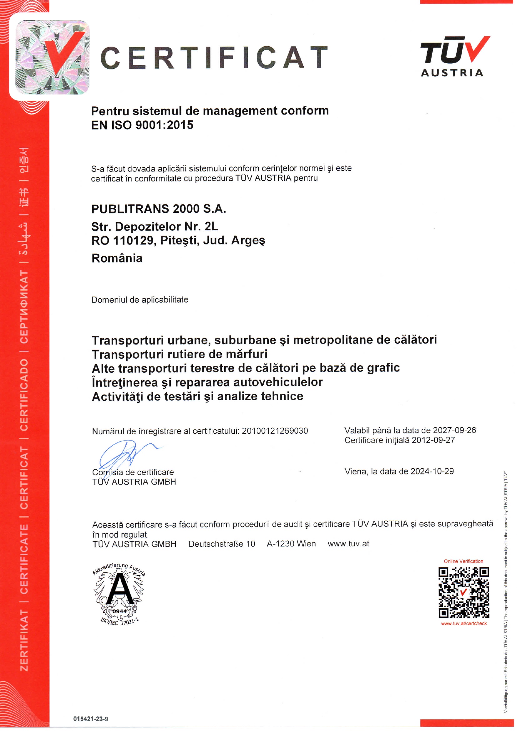 cod CAEN 4931, are implementat un sistem de Management conform cerintelor standardelor internationale ISO 9001: 2015.